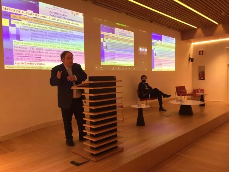 En primer lugar, Nicanor Prendes nos ha ilustrado sobre los condicionantes legales que ya tenemos sobre la mesa de trabajo y los que vienen, incluida la Ley de Cambio Climático, que se encuentra en la última fase de tramitación. Nos ha invitado a mantener la energía hidroeléctrica como medida de mitigación, así como a recuperar la capacidad de los embalses, retirando sus sedimentos, y devolviéndolos a sus estados originales, como medida de adaptación. Desde la Oficina Española de Cambio Climático han elaborado dos planes de vital importancia, el Plan Nacional de Adaptación al Cambio Climático y el Plan Nacional Integrado de Energía y Clima, además de realizar las oportunas matizaciones en las Normas Técnicas de Seguridad.