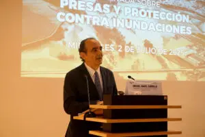 Carlos Granell (Presidente de Spancold) recordó la declaración de ICOLD de 2019 en la que se dice que el cambio climático tiene una influencia clara sobre la seguridad de presas, hecho que hay que afrontar y destacó el papel relevante de las presas en la protección contra inundaciones.