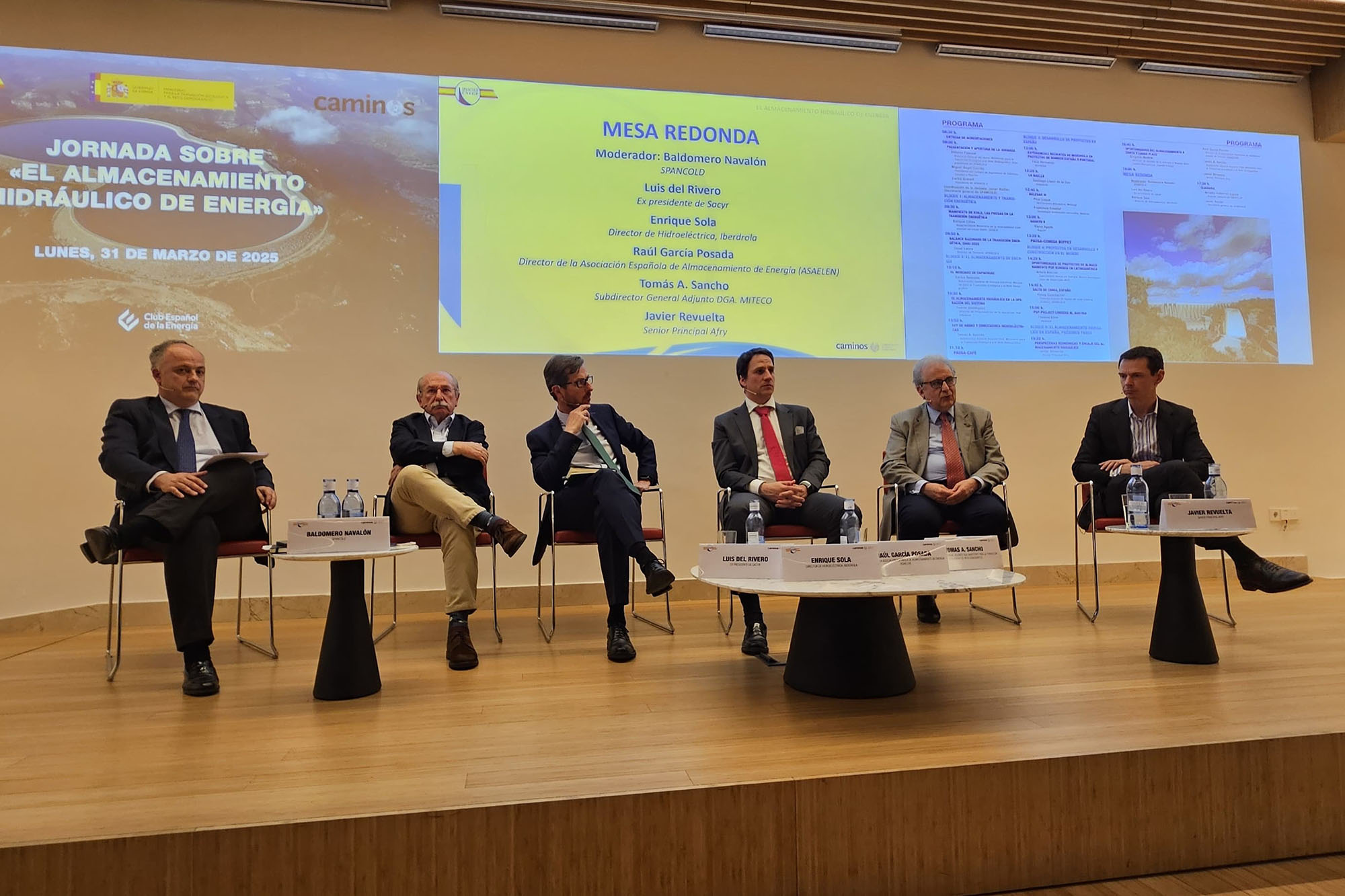 Mesa redonda. A continuación, se procedió a la celebración de una mesa redonda moderada por Baldomero Navalón. En ella intervinieron Luis del Rivero (Ex Presidente de Sacyr), Enrique Sola (Director de Hidroeléctrica de Iberdrola), Raúl García de Posada (Director de la Asociación Española de Almacenamiento de Energía, ASAELEN), Tomás Sancho y Javier Revuelta. El arranque del coloquio consistió en efectuar una serie de preguntas por parte del moderador, que fueron respondidas y comentadas por los participantes. Las ideas principales que se expusieron fueron: