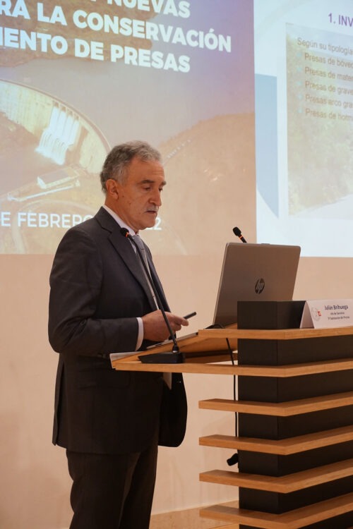 La séptima ponencia estuvo a cargo de Julián Brihuega Jiménez (Jefe Servicio 1º de Explotación CHE) acerca de la conservación y mantenimiento en las 56 grandes presas (49 de las cuales en categoría A) de la Confederación Hidrográfica del Ebro destacando la descripción de la aplicación PMP incluida dentro del SAIH y la descripción de los trabajos correctivos llevados a cabo en diversas presas (Ebro, Val, Loteta, Enciso y Grado).