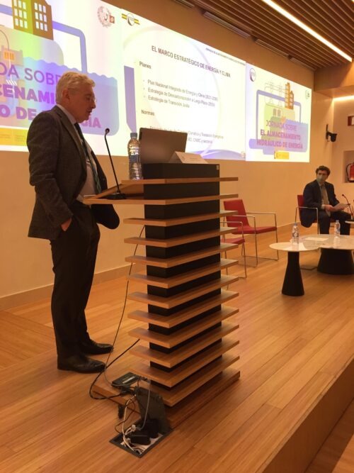 Seguidamente Victor Arqued (Subdirector General de Planificación Hidrológica del MITERD) expuso el papel esencial que juegan las centrales de bombeo dentro de la estrategia general del almacenamiento de energía